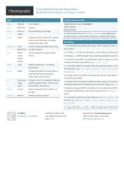 The conventional commits specification is a lightweight convention on top of commit. Web conventional commits 1.0.0 summary. Enjoy this cheat sheet at its fullest within dash.