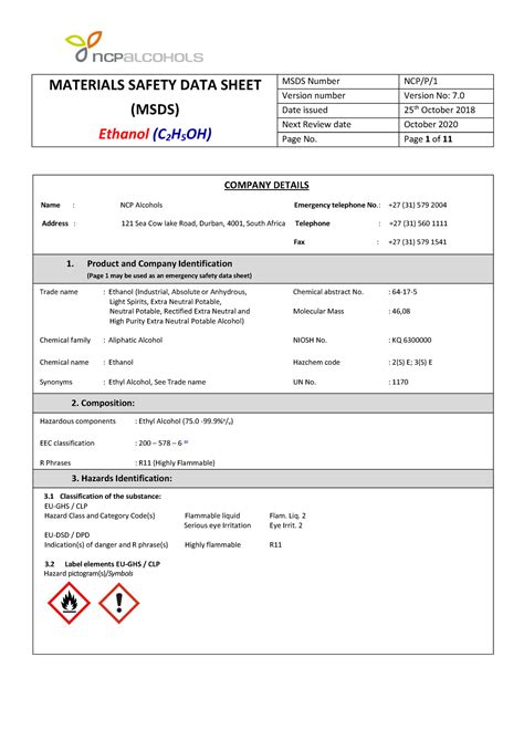 Ethyl Alcohol Safety Data Sheet Ethanol Water