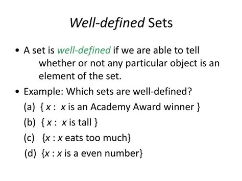 Example Of Well Defined Set In Math. There can be any number of items, be it a collection of whole numbers, months of a year, types of birds, and so. All have their own value.