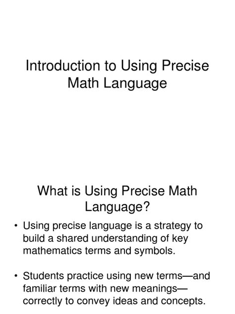 Precise Math Language. Web between precise language use and mathematical argument, and explore how blurring the borders of two types of pedagogical tools (attention to precise mathematical language and engagement. Here are a few ways that i encourage my students to routinely infuse formal math vocabulary in the classroom, and a few terms that i’m a particular stickler about with my students.
