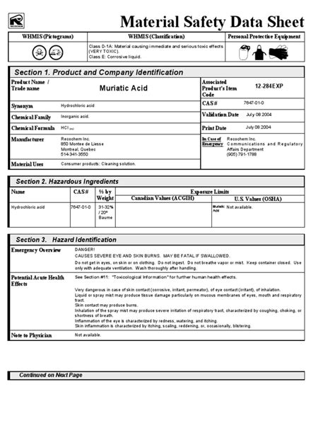 Identification of the substance/preparation and the. Chlorohydric acid, hydrogen chloride, hydrochloric acid. Muriatic acid 10.4% whmis classification:. Web revision number 4a, revision date 14.01.28.