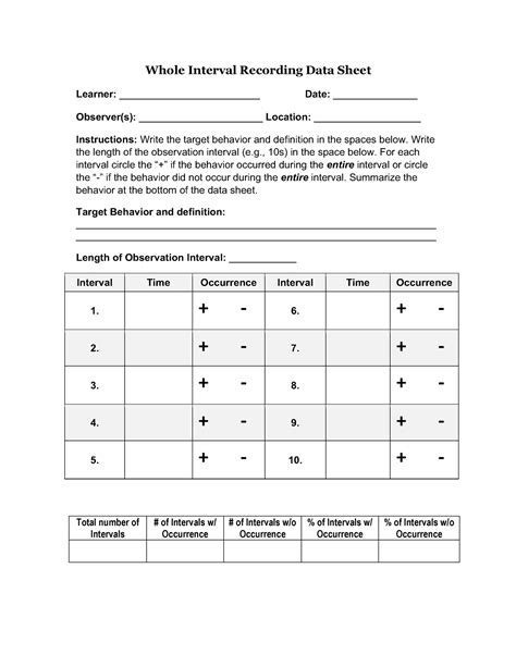Whole Interval Recording Data Sheet. Web learn how to use whole interval recording to observe and measure ongoing behaviors that occur or do not occur during specified time. Web whole interval recording system, the teacher observes the student for five minutes.