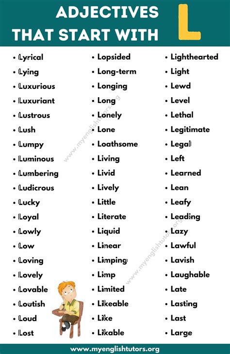 Web adjectives that start with l to describe a person lackadaisical lame languid lanky large larger largest lascivious last late laughable laughing lavish lawful lawless lazy lead leading lean learned. Web here’s a list of over 400 descriptive adjectives that start with l that you can use in your writing. Adjectives are used to describe or modify nouns or pronouns. You can use this list to help you find the exact word you're looking for in terms of its meaning or its length. Lonely, lively, lovable, luminous, loud, lazy, luxurious, loving, loyal, and lucky. Web adjectives that start with l to describe a person lackadaisical lame languid lanky large larger largest lascivious last late laughable laughing lavish lawful lawless lazy lead leading lean learned. Web here are our top 50 adjectives that start with l: Web adjectives starting l here is a list of 150 adjectives that start with the letter l. Web what are some adjectives that start with l?