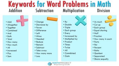 Math Keywords For Word Problems. Cubed times each groups area product of per triple quadruple increased by multiplied by double/twice (multiplication by 1⁄2 ) times.