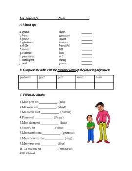 Adjectives In French Worksheet. Web some of the common french adjectives are listed below: Petit (small), jeune (young), bon (good), delicieux (delicious), fort.